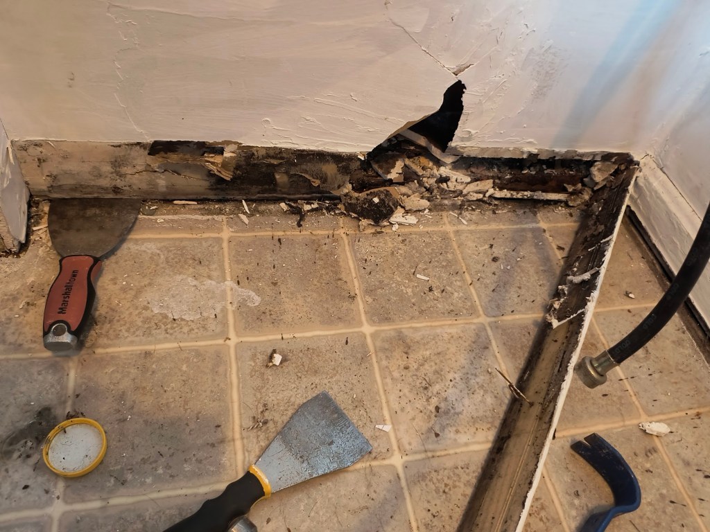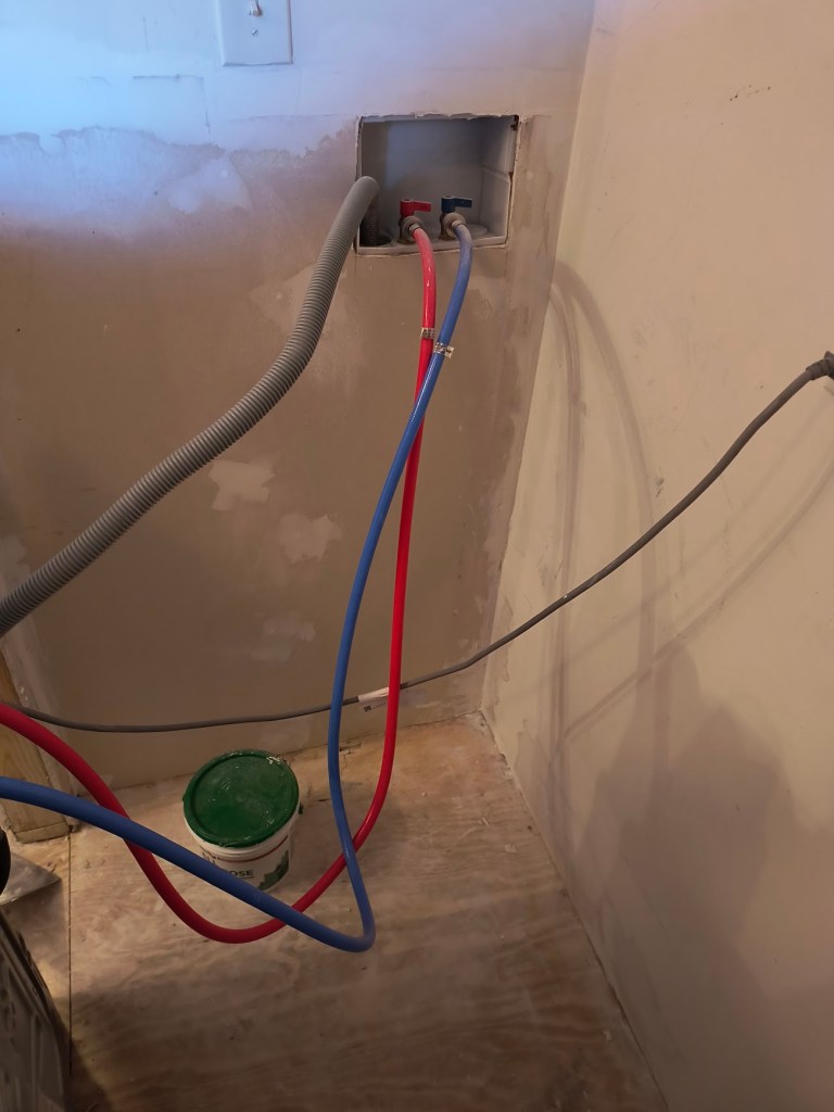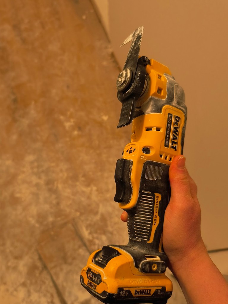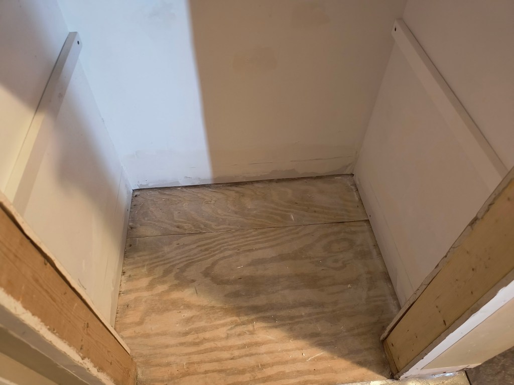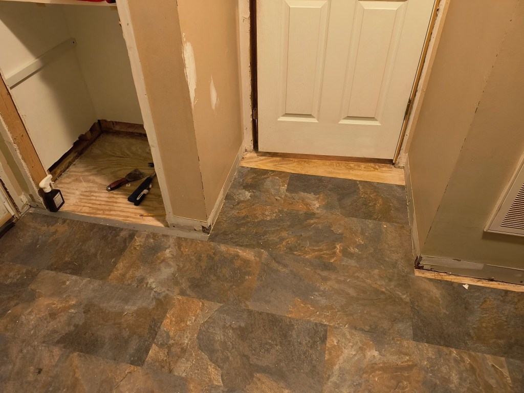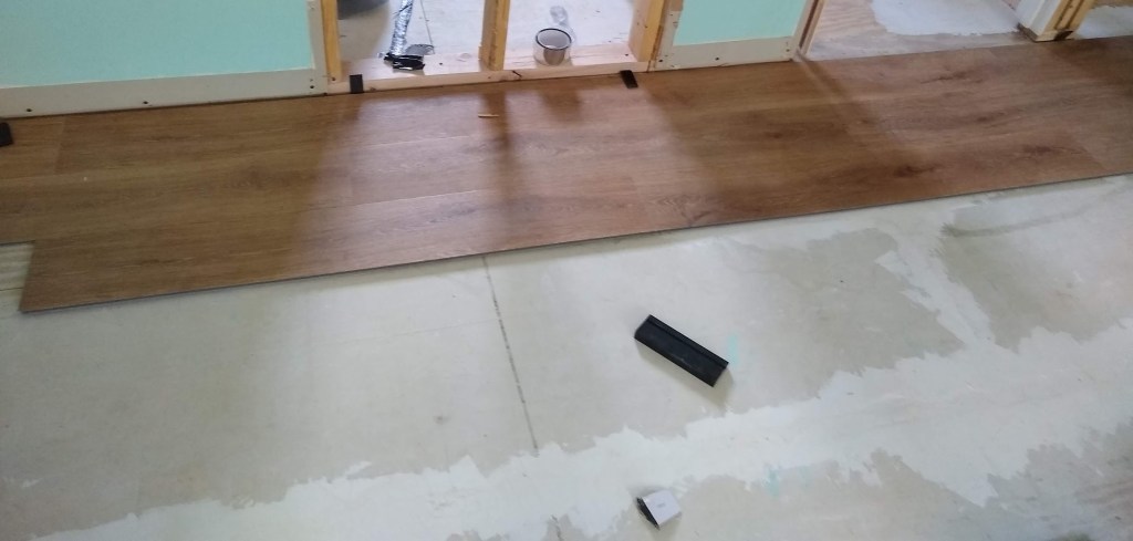 Once we finish the walls, I can finally finish installing the lovely LVP tile that we selected. After installing the baseboards, we can move the washer back to its rightful place. This means there’s only one more room to install flooring in: the master bathroom.