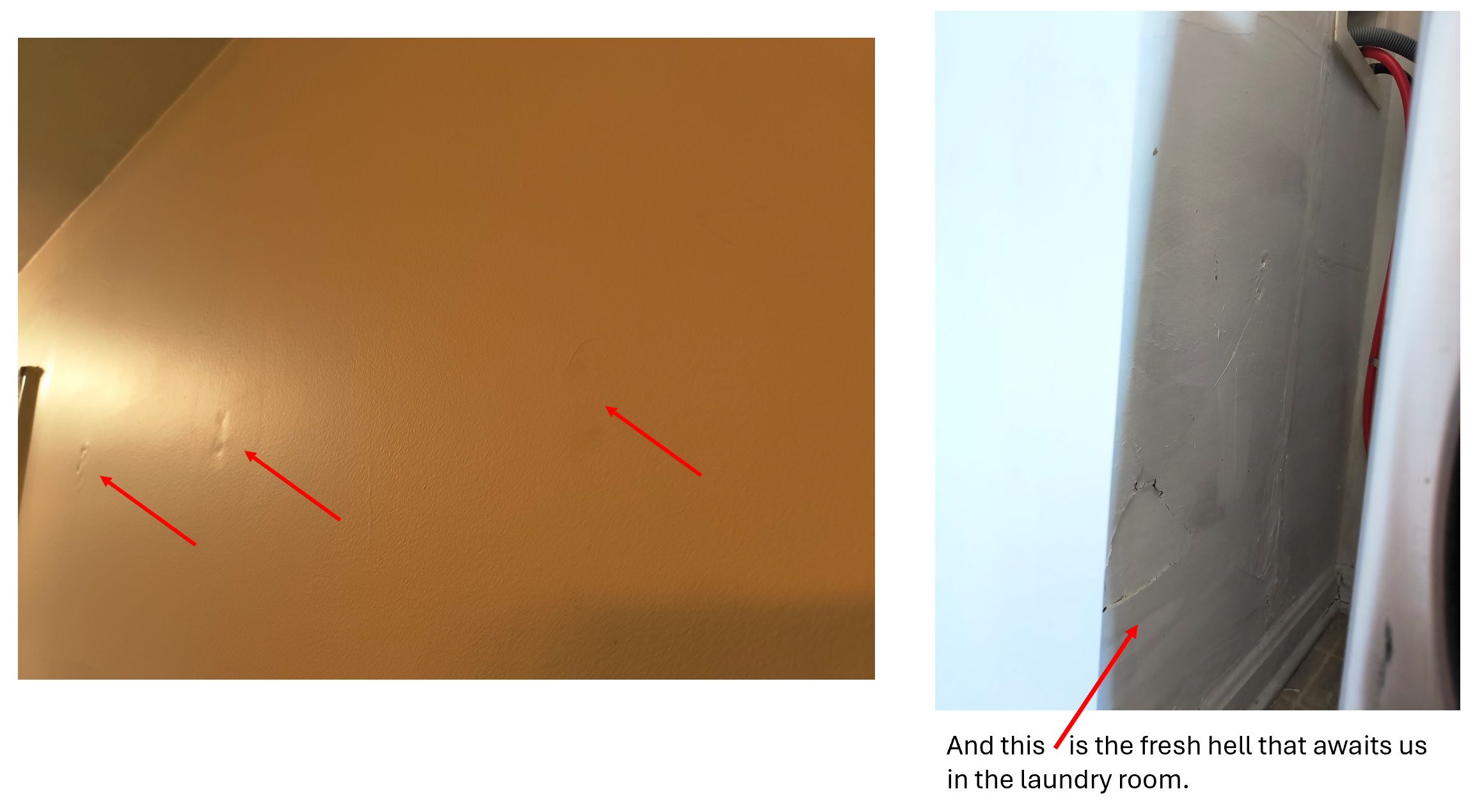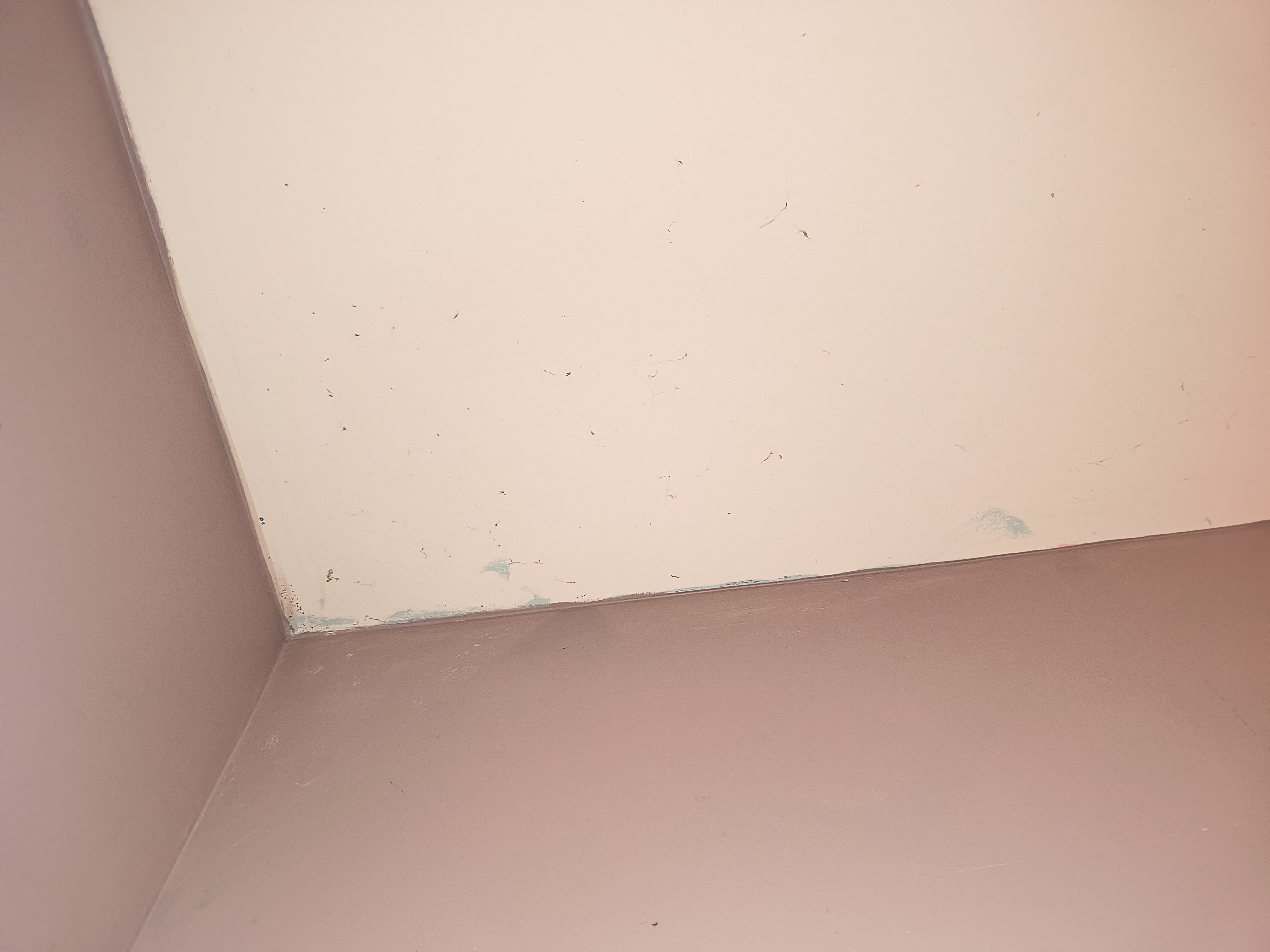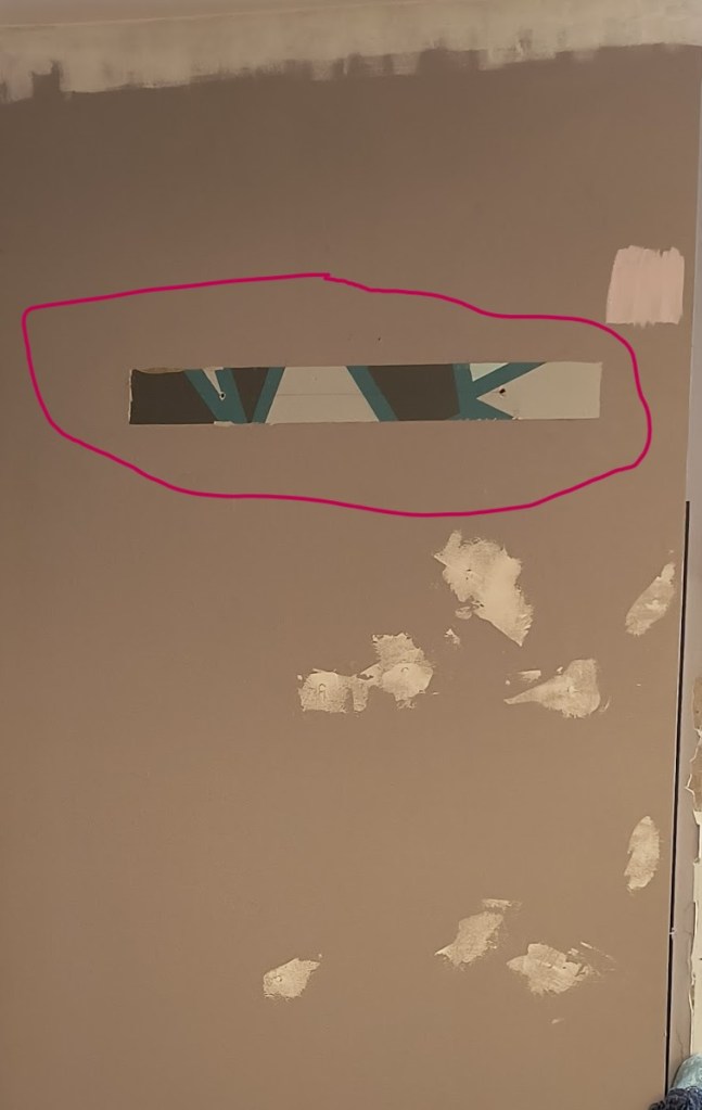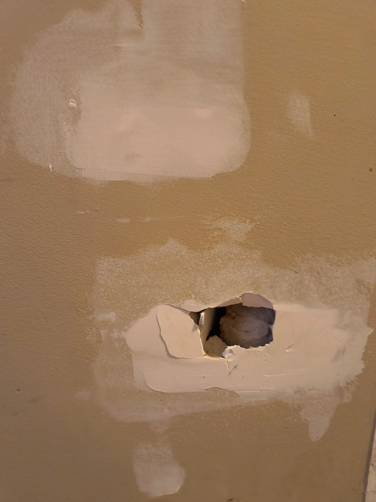 Half of which were ½” drywall anchor holes, and 5 of the holes were on the ceiling. One of the ceiling holes was 1 inch in diameter. Like what the….were you trying to hang a bike in here or something??