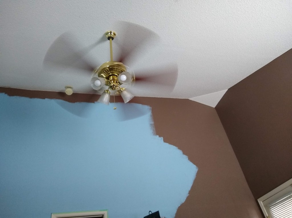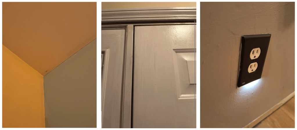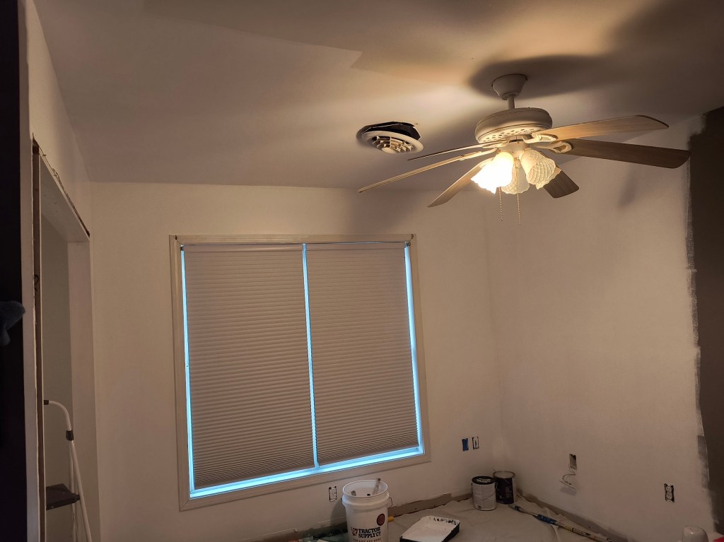 Then there’s all of the dark paint taps where the ceiling meets the wall. I have to go over and over that edge to cover them up before I can paint the whole ceiling. I have no idea why, but there’s a lot more of those in this bedroom than the last one.