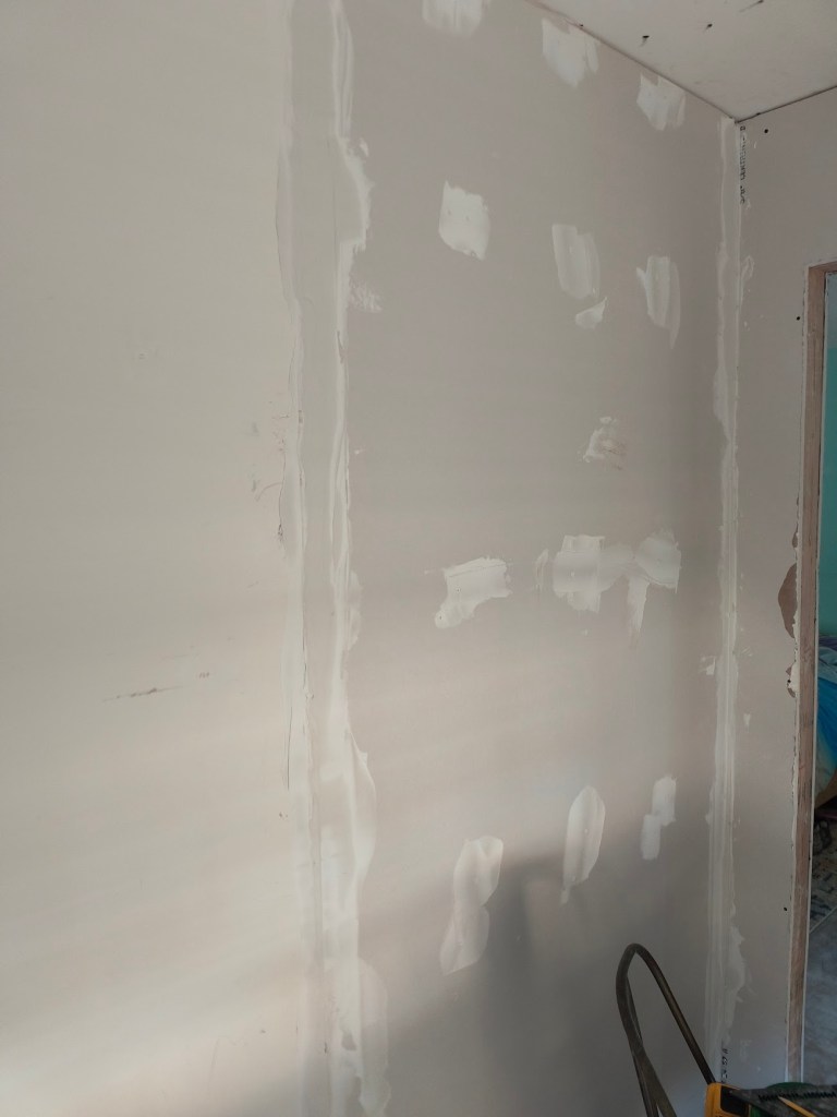 The laundry and pantry walls are also mended, now we’re doing the mud/sand/wipe/mud dance with the seams now. After that is finished and set, we’ll be priming with this mold and mildew resistant primer, following with a moisture-resistant satin or semi-gloss paint, and sealing with this kitchen and bath sealer and protectant.