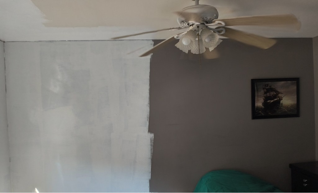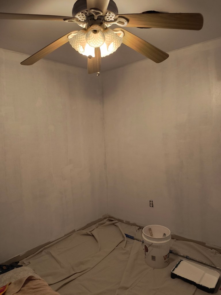 Despite it all, I am making progress. This picture represents the first coat of white is on bedroom #2’s walls. I’m ecstatic that I don’t have to look at the leopard pattern of spackle splotches anymore.