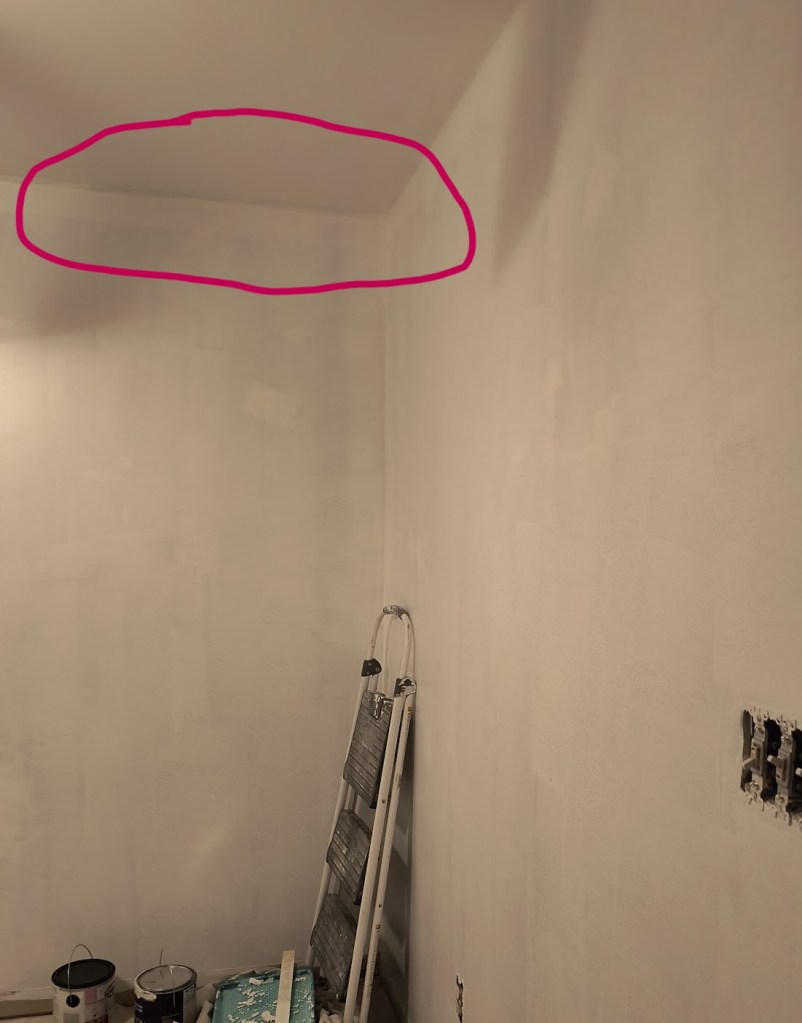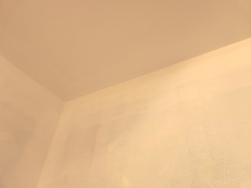 Whilst working on refreshing the ceiling, I ran into another unexpected setback. I was touching up the ceiling edge with what I thought was the same ceiling paint as before. It was, except for the brand name. Apparently, that made a huge difference, and I don’t mean in terms of coverage.