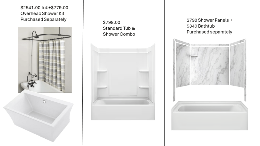 I know that the common all-in-one tub/shower combo is the most cost-effective, however I think the master bath should have something more elegant and attractive yet sensible. The first option speaks to my old soul and love of vintage and antique-esque things, but that price tag gives me pause.
